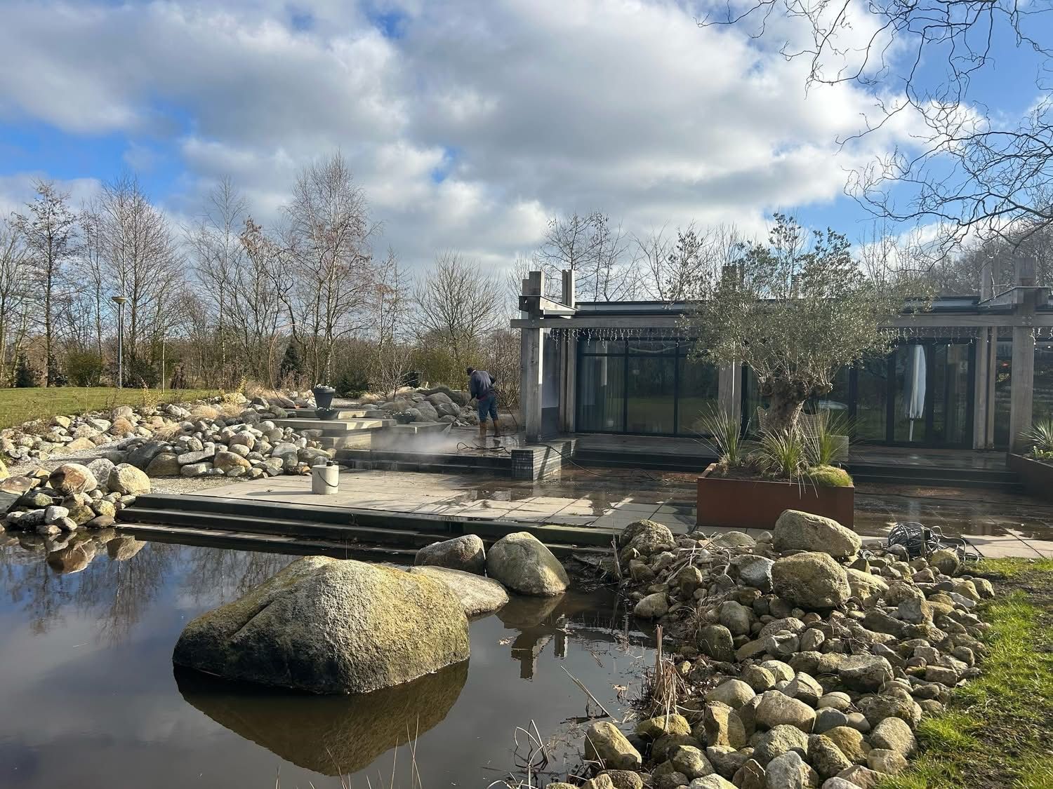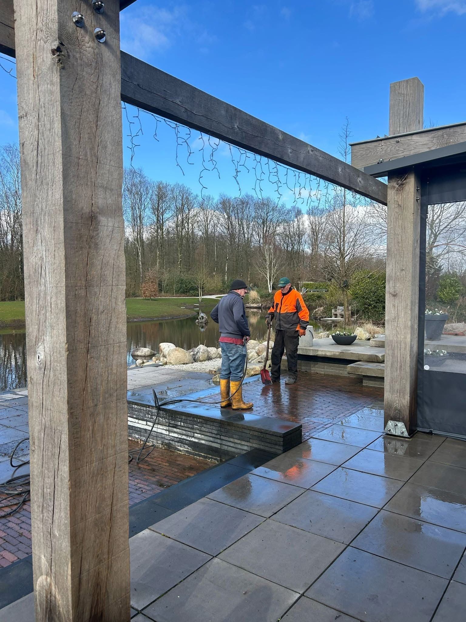 Zo is het terras weer helemaal schoon, hebben de bankjes een nieuwe kleur gekregen en is er zelfs een nieuw vlot gemaakt voor in de vijver.